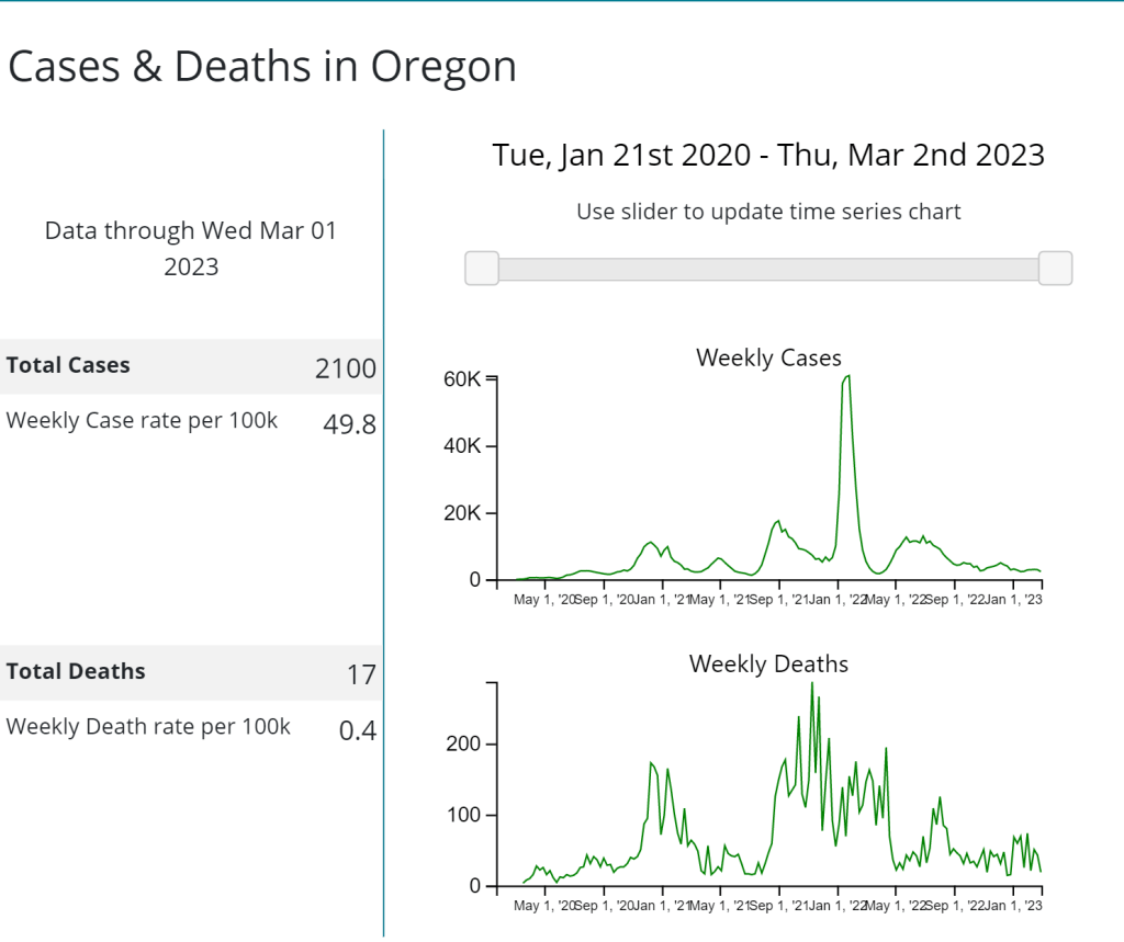 - Transmission levels remain high. Despite OHA’s rosy projections, I think few experts feel comfortable in making any long-term projections as to how SARS-CoV-2 will continue to evolve and what threats it may pose.